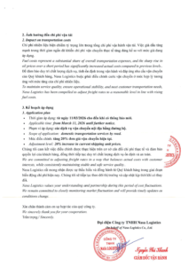 Do biến động mạnh của giá nhiên liệu trong thời gian gần đây, chi phí vận hành vận tải và logistics đã tăng đáng kể. Để đảm bảo duy trì chất lượng dịch vụ và ổn định hoạt động, NASA Logistics xin thông báo điều chỉnh đơn giá vận chuyển nội địa.